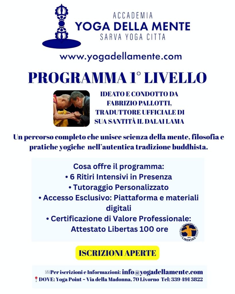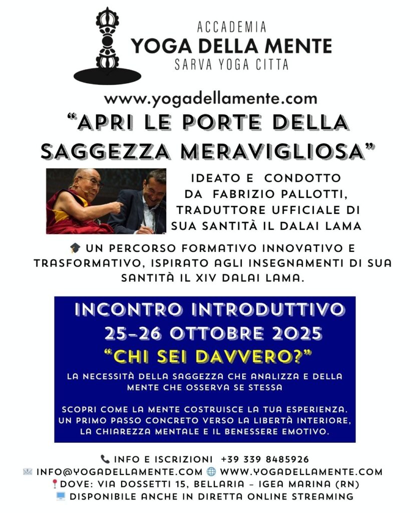L’Accademia Yoga della Mente – Sarva Yoga Citta promuove il benessere attraverso un approccio unico che integra scienze della mente, scienze contemplative e la filosofia nelle tradizioni dei grandi maestri buddhisti indiani e tibetani. Con l’obiettivo di favorire pace mentale e crescita interiore, l’Accademia offre percorsi di sviluppo personale in armonia con i principi yogici di Metodo e Saggezza del buddhismo Mahayana.